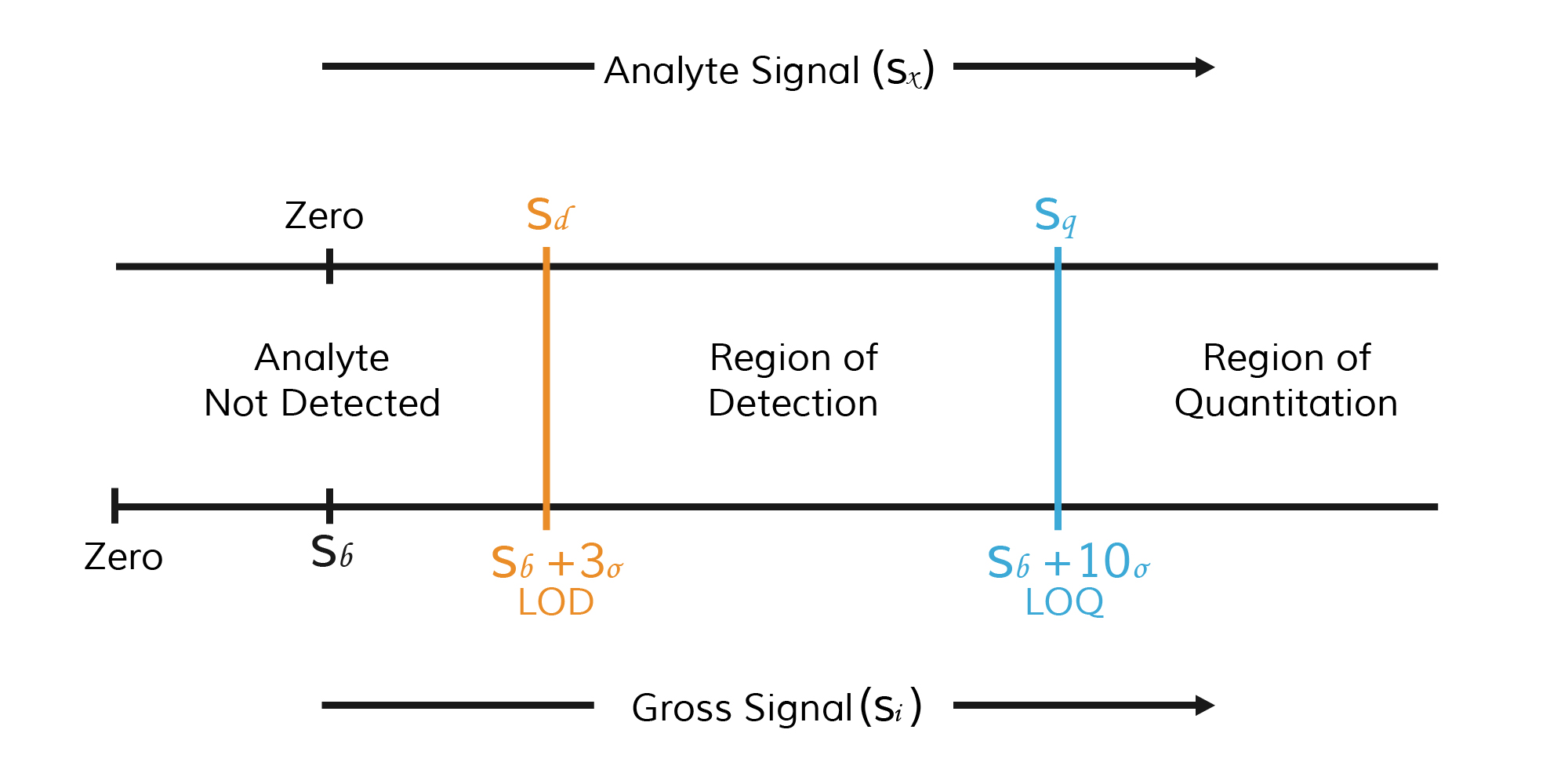 定量限(LOQ)定義為“根據(jù)統(tǒng)計學(xué)原理可以定量測量的分析物的最小量或濃度”。如果樣品中分析物的量超過此值,則樣品可以以一定的相對標(biāo)準偏差定量。將濃度分為三個區(qū)域以了解LOD和LOQ之間的區(qū)別。如果實際濃度低于LOD,則視為“未檢測到”;如果實際濃度介于LOD和LOQ之間,則視為“定性檢測”;如果實際濃度高于LOQ,則視為“定量測量”。在此濃度下,信號足夠穩(wěn)定和一致,并且落在標(biāo)準曲線的驗證范圍內(nèi),從而確保可重復(fù)性和精確度。根據(jù)信號檢測理論,我們可以將由背景噪聲引起的空白中測量的值用作基線,作為測量值的零點。美國化學(xué)學(xué)會環(huán)境改進委員會進一步細化了這些定義:LOD=Sb+3σ,LOQ=Sb+10σ,其中Sb是空白信號測量的平均值,σ是空白信號測量的標(biāo)準偏差。