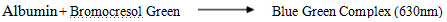 白蛋白是人體血漿中最主要的蛋白質, 由肝臟合成,是人體內一種重要的營養物質,可以維持血漿滲透壓, 并可與多種營養物質、 激素和藥物相結合。白蛋白含量可以反映機體營養狀態,也可排查影響肝臟代謝功能的疾 病, 如肝硬化、 肝損傷、營養不良、惡性腫瘤等。血清白蛋白在pH4.2的緩沖液中帶正電荷, 在有非離子型表面活性劑存在時, 可與帶負電荷的染料溴甲酚綠結 合形成藍綠色復合物,在波長630nm處有吸收峰,其顏色深淺與白蛋白濃度成正比例。